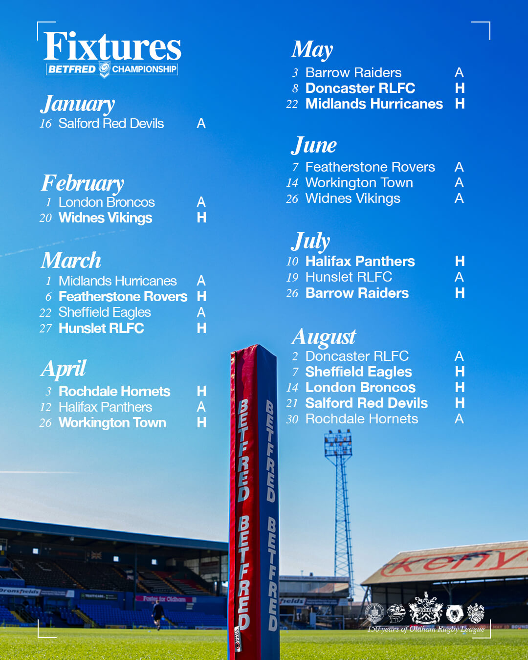 2026 marks the first season of the revamped Championship, now featuring 21 teams. Rochdale, Midlands and Workington all return to Oldham’s fixture list for the first time since 2024.